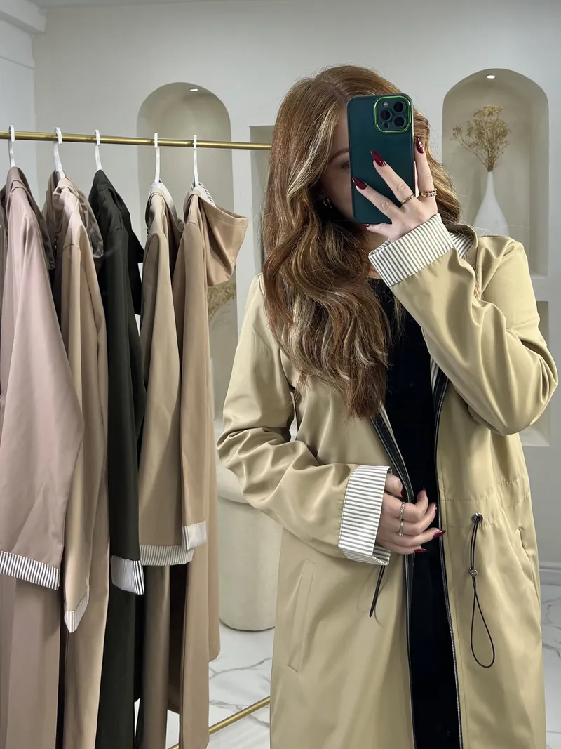 فيها كابيشون واسع، سحاب أمامي كامل، وخياطة فنية على الخصر تعطي شكل جميل وأنثوي 💛